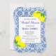 Portugisiska plattor, citroner, Medelhavet, blått, sommar, inbjudan till mönster. Elegant, vacker, inbjudningskort för möhippa. Hand målade vattenfärgsblånät själv. Anpassa den med dina detaljer.
