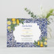 Hand målade traditionella plattor från Portugal med citroner från Medelhavet. Azulejo, blå och vit blommigt, löv-platta teckningar. Ett vackert Medelhavsmönster som skildrar citroner av gult med deras gröna och blommar mot en blå och vit vintage i Portugal mönster. Texten i bröllop är elegant ramad med en vit geometrisk form. Unik utformning av Azulejo-blått och vitt bröllop spara datum-kort med modern inslag. Det finns också möjlighet att matcha bröllopsinbjudningar och andra artiklar i kontorsartiklar.