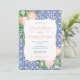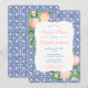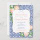 En bröllopsfest inbjudan design med akvarell persikor / azulejo blå kakel.