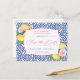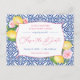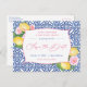 Bröllop spara datum har en handmålad vattenfärgscitron med glansig grönt löv och rosa blommigt mot bakgrund av en vintage kobolt blå och vit Medelhavsbricka mönster.