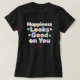 glad svart t-shirt med ett positivt, upplyftande meddelande som lyder "Lycka ser Bra ut på dig" i färglös, lekfull text. Skjortan modelleras av en kvinna med långt hår som leker vid kameran, perfekt med den positiva känsla som uttrycks på plagget. T-shirt-konstruktionen står mot sin svarta bakgrund, med den skarpa texten med flera färgader skapande en pulserande kontrast som fäster uppmärksamheten på det upplyftande budskapet. Avslappnaden stil i skjortan gör den mångsidig för vardaglig bära samtidigt som den sprider sig positivt var man än går.