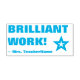 Den här motiverande utformningen av gummi frimärke innehåller det positiva feedbackmeddelandet "BRILLIANT WORK!" och en skräddarsydd lärare namn. Den har också en dekorativ stjärnikon. Det skulle kunna användas av en skollärare eller en skollärare när man graderar student, för att erkänna att ett student har gjort ett enastående arbete.
