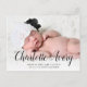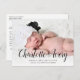 Detta vykort för söt födelsemeddelanden har ett stort foto och ett påstående namn. På framsidan av vykortet kan du lägga till ett fullt-blekt foto av ditt nyfödda vågrät. På framsidan finns också en svart textövertäckning som visar din baby namn i modern kalligrafi. Lägg till födelseinformation och namn nedan. På baksidan av vykortet hittar du utrymme för skriva av ett längre anpassningsbar-meddelande till nära och kära.
