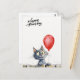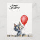 Diese selbstgestaltete Karte zeigt eine süße Katze die über einen Zaun schaut und einen roten Luftballon in der Hand hält.