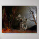En skogskvinna, en solitär vinkvinna i skogen, upphöjd broom i handen, åtföljd av en glidande uggla och en arg katt - fotograferad tillsammans i samma biet av det västra bergsvirket - rusar mot en förödande brand för sent för att spara offret, men hoppas ändå kunna stoppa dess spridning. Figurer av inkvisitorer/domare stiga upp spökliknande från ledamöterna mot ett fullt måne med ett sullen red ring.