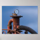 Sparrow sitta bakom mätaren och ovanpå ett rött och rostigt gammalt maskin som användes för att kontrollera luft tryck på tidigt kväll i augusti