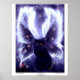 En svart älvkatt med lila som kastar vingar mot stjärnbakgrund. Oskuld Fairy Cat av Michaeline McDonald. copyright © Michaeline McDonald.