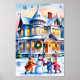 Ett viktorianskt hus täckt av snö med varmt ljus glatt inne, en andedräkt på dörren och barn som leker utanför.