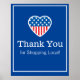 Ett tack till kunder och community som stöder lokala/små företag. Båda linjerna kan anpassas. Patriotisk hjärtgrafik på blå bakgrund med tunn vit gräns ram.