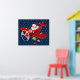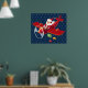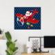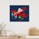 Tomten flyger ett flygplan och tappar inslagna gåvor. Bakgrunden är en mörk blått med att mönster poster snöflingan.