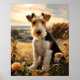 En poster med en scen av Wire Hair Fox Terrier sitta på en kullsida mellan blommor på landsbygden i höst. Den här poster kommer säkert att glädja alla som kärlek Wire Hair Fox Terriers. generativecvecontent