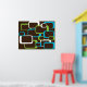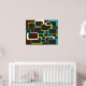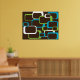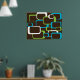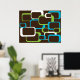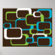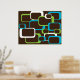 En färglös design av lime green, white och turkos blue retro-inspirerade fyrkanter mot en chokladbrun bakgrund på en poster