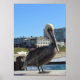 Pelican står lugnt på piren. Perfekt och surfa ger en bakgrund, tillsammans med högt stiga upp byggnad. En strålande blå vinter himlar avslutar scenen.