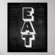 En poster i ett typografiskt kök har fet text att äta på en tryckt grått-bakgrundsvägg för köket.
