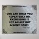 Den här motivationsdugligheten poster i stål och svart är ett fitness-citat från den motiverade författaren och designern Felicity Luckey. Den här gymmet poster i en serie av 52 motivationsgym poster för inspiration och träningsmotivation. Lösencitatet lyder: DU ÄR VAD DU UPPREPADE GÅNGER GÖR. UTÖVANDET ÄR INTE EN AKT UTAN EN DAGLIG HABIT. ~ Felicity Luckey