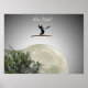 Gymnastsoar över en fullt måne. Måne ljusar mörken himlar och beskriver gymnastikens sträckning i mitten av ett språng.Träd överst vid grund lämnat.