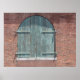 Dörren för det armade träet i färg i koppar-grönt i väster är placerad i en röd tegelvägg. Skuggor med gångjärn och överhängande djupet i tak ge till bilden. (Fotografi taget på Mare Island, Vallejo, Kalifornien)
