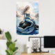 Poster av en sjöjungfru med ett långdraget hår sitta på ett skonsamt sätt på sten, omgivet av lugn över havets vatten och avlägsna klippor. Mjukt pastel färg förbättrar scenens lugn och magiska atmosfär.
