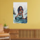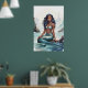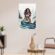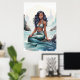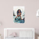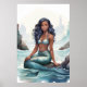 Poster av en sjöjungfru med ett långt, blommande hår sitta på ett skonsamt sätt vid ett sten omgivet av lugn oceanen vågar. Tornformationerna i sten härstammar från misternas bakgrund och skapar en seren och mystisk atmosfär.