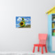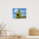 Solrosa blommar. Två ljusa solrosor av gult med brunt backe, blå himmel och fluffyvita moln i bakgrunden. Den här bilden kommer att göra valfritt rum ljusare.