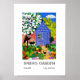 Ett poster av ett handmålat pappert kollage av Judy Adamson från ett Vår Garden med ett blått hus, blommar träd, fågel bord, vattentråg, stövlar, björnfågel och en katt som sover på en vit bänk. Alla tillgängliga storlekar, inklusive gratulationskort.