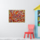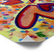 Ord "Lycklig" målas i en ljusmarigold orange mot en regnbågsspeglad bakgrund. Hjärter av olika storlek överlappar varandra och flyter som fjärilar runt texten. Den här målningen finns också i en glitter-version.