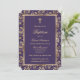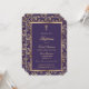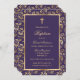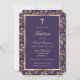 Elegant lila och blommigt baptism i guld som innehåller en inbjudan till guld kor i en blommigt ram.