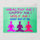 "Hälsosam är jag, Lycklig är jag, Heliga är jag, och så är det" - en daglig bekräftelse som rekommenderas av mediet James Van Praagh. Positiva bekräftelser bidrar till att öka energiförbrukningen. Det finns tre mediterande personer under bekräftelsen.