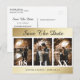 Fotot från elegant bröllop sparar datumet på vykort med förlovning fotokollage på guld. Personlig guld bröllop spara datum-kort. Anpassade guld bröllop spara datum-kort. Ett stort antal bröllop spara datum-kort. 3 foton spara datumkorten.