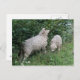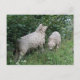 Det här söta vykortet innehåller ett foto av ett par söta fluffa får. Fårarna omges av vild blommor och långgräs och står under ett träd och når upp och äter högljutt lite löv. De har tjockvita jackar av ull och mycket sött ansikte.