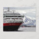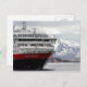 Hurtigrutens kryssningsanläggning som ankommer till frakten i slutet av Vår, i bakgrunden till Tromsø, är fortfarande täckt med vit snö.