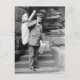 Ett foto av en postbärare i vintage, svart och vitt, i uniform, på postkontorets fotspår. Postsäckar kan ses i bakgrunden. Foto c. 1914 från Harris & Ewing