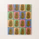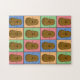 Rolig färgglad pussel i pop art-stil med ett mönster av olika färgade rektanglar som alla har en glad brun potatis i mitten.