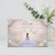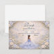 This elegant quinceañera design features a soft powder blue watercolor background framed by delicate ivory roses, subtle greenery, and ornate gold detailing, with a graceful gown illustration creating a refined, fairytale-inspired atmosphere. The cool blue palette paired with romantic florals gives the design a timeless, luxurious feel, perfect for a classic quinceañera celebration with an elegant garden aesthetic.