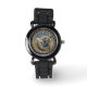 Komplext förvirrande av den astronomiska baroque-mekaniska klocka från stil från Prag i svart och guld.