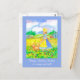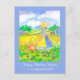 Ett postkort från grattis på födelsedagen dekorerat med en ung flicka i en prärieklänning och en bonnet som går hennes lycklig hund i fält i Black Eyed Susan-blommor med en röd lada, silor och gård högst upp på fält i den avstånd illustrerad med vattenfärg.