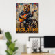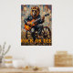 Denna dynamiska grafik visar en lejon, tittar coola i solglasögon och i läder jacka, mästerligt "sönderdelad" en elektrisk gitarr när den genomkorsas på ett vävt vagnshjul. Scenen utspelar sig i en stor, gyllene prärie med avlägsna backe under ett dramatiskt himmel. Den tjocka, uttryckliga impaston skapar ett konkret struktur, skapar "Sten eller Die"-deklarationen som svarar mot prestandans råenergi