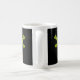 Fotografi av en bönemant som står på en boll på svart bakgrund. Utformning på båda sidor om mugg.