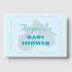 Design front features a pale blue background to the image of delicate crocheted baby booties in center. Name of guest-of-honor is displayed in an elegant, ocean blue font. Event heading is featured below in bold. An elegant flourish borders design.