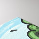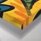 The background unfolds with rolling hills depicted in distinct bands of vivid greens, oranges, and pinks, creating a layered and almost quilted appearance. A flowing blue body of water meanders through the midground, its surface reflecting a bright, almost iridescent quality.
