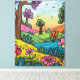 In the foreground, a profusion of oversized, stylized flowers in shades of pink, red, and yellow burst forth, accompanied by various green leafy plants and decorative swirls. The sky transitions from a soft blue to a warm yellow and orange at the horizon, with several small, black bird silhouettes soaring against it. The overall impression is one of joyful imagination and vibrant storytelling, rendered with an almost tactile, childlike artistic expression.