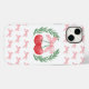 Iphone case med preppy coquette-estetik i rosa och vitt. Utformningen har körsbär som är bundna med en rosa och inramad med en logotyp stil lagerkrans. Med en mönster av rosans bovar som matchar körsbärets logotyp. Designad för iPhone 14 Plus men passar många andra modeller. Om du väljer en annan modell kontrollerar du att designen fortfarande ser underbar ut i förhandsvisningen och om det behövs är den svag (klicka på "redigera med designverktyget verktyg").