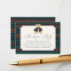 Invite guests to help build baby’s first library with this preppy book request card featuring a hand-painted watercolor teddy bear dressed in a green bow tie and a classic navy and dark red plaid coat. The sweet illustration appears above “Books for Baby” in elegant green calligraphy, with your personalized message displayed below. All text sits within a vintage-style cream frame, set against a rich watercolor plaid background in shades of green, navy, red, and yellow. Perfect for fall and winter baby showers, this timeless design adds a charming, coordinated touch to your We Can Bearly Wait baby shower suite.
