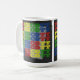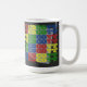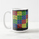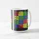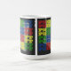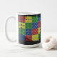 Kaffet mugg är en färgad svart med vita handtag och vit fälg i, men det innehåller grått, rött, gult, grönt och blått bläck. Det gör det idealiskt för kaffe eller te på morgonen. Det är mikrovåg och diskmaskin säker.