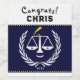 Kreativt juristexamenpresent eller flasketiketter och juristfestdekor med rättvisans våg och studentmössa på marinblå bakgrund. För att anpassa, redigera texten för att lägga till namn och år.