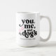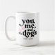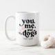 En snygg present till ett par som är hundföräldrar. Färgen på orden "You, me, and the dogs" samt färgen på tassarna kan ändras genom att välja alternativet Redigera med designverktyg när du anpassar. Färgerna kan ändras till olika färger på varje sida av muggen. Du kan göra det till en present till ett par och ha olika färgscheman för varje person.