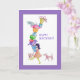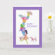Illustration av en flicka som bär en torn av färgade gåvor, två hundar som springer på hennes fötter och en katt som är balanserad överst i pilen. Underbara kort och gåvor till alla tillfälle.