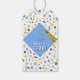 Kreativa gratulationspresenter och partytjänster för examen, med ljusblå mössa och gul tofs på konfettibakgrund. Redigera texten för att lägga till examenets namn och avgångsklassens år.