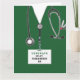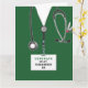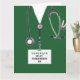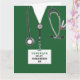 Kreativets sjuksköterskekort i studenten med unika sjukhusskrubbar i grönt, ett stetoskop och en schweizisk armé i knivar. Om du vill anpassa redigeringstexten så att namn av sjuksköterska läggs till.
