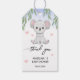 Presentkort "Tack" för baby shower, dekorerat med en söt illustration av en koala och eukalyptusblad.